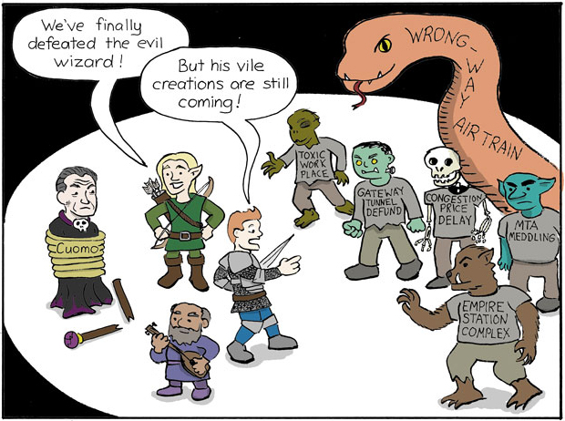 As our national treasure cartoonist Bill Roundy points out today, the delay in congestion pricing will continue (the Times quoted future governor Kathy Hochul as saying the already approved Midtown tolling plan needs another look), the wrong-way AirTrain is set to break ground this summer, the toxic culture of Albany persists, etc. etc.