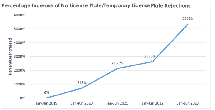 The increase in Verra rejections is particularly troubling because the number of rejections due to a reckless driver having a temp tag (real or fake) or having no license plate at all rose by 5,356 percent between 2019 and mid-2023 (see chart below), as Streetsblog has long documented. DOT has previously admitted that its cameras cannot read temp tags, real or fake.