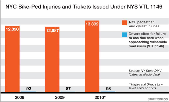 Juan Martinez, general counsel for Transportation Alternatives, told Streetsblog in May that the prohibition against beat cops writing careless driving citations is contradicted by case law and a state attorney general opinion. Though the policy does not apply to the department's Accident Investigation Squad, NYPD routinely issues fewer than 100 VTL 1146 citations per year.
