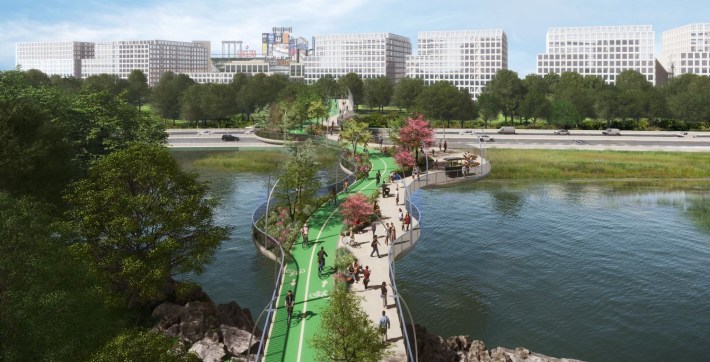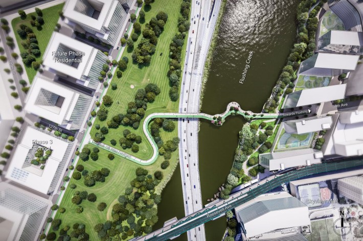 Those improvements mean “Flushing Skypark,” a bike and pedestrian bridge “lined with recreational and congregate areas,” the developers said in a statement, that will connect Flushing from its western edge at 39th Avenue and College Point Boulevard to Willets Point on the other side of Flushing Creek.