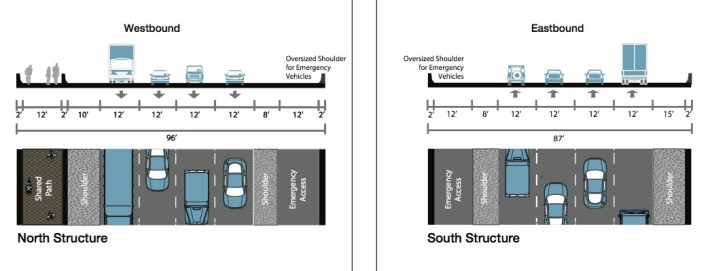 Letting buses run in the emergency lanes would be an easy and essentially cost-free way to make bus rides across the bridge a little faster. The emergency lanes will be built in addition to full-width shoulders on both sides of traffic, a feature unheard of on other major new bridges. All that space is primed to be converted either into bus lanes or more room for cars.