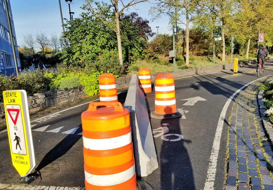 The jersey barriers are still bulkier and more obtrusive than the steel bollards that advocates have asked for. In a statement to Streetsblog, NYS DOT Chief of Staff Cathy Calhoun said the barriers are a "short term solution."