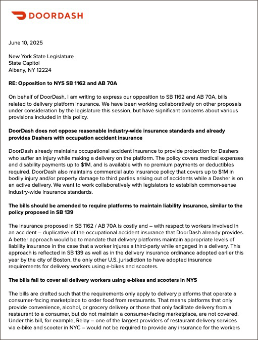 “DoorDash already provides Dashers with occupation accident insurance,” reads the memo from the company's regional head of government relations Kassandra Perez-Desir. While technically true, DoorDash’s own website says that the insurance “does not cover damage to your bike or car,” which would have been covered by the Carroll bill (co-sponsored by Sen. Liz Krueger, Democrat of Manhattan).