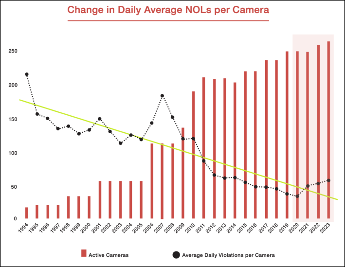 "Since 2020, we have seen a 54-percent increase in the number of violations issued at each camera each day, a sign of the changing attitude toward red-light running across the city," states the report [PDF]. "This increase has happened alongside a spike in traffic fatalities and indicates the need for more consistent enforcement and stronger sanctions, including the option of suspending the registration of vehicles with repeated offenses."