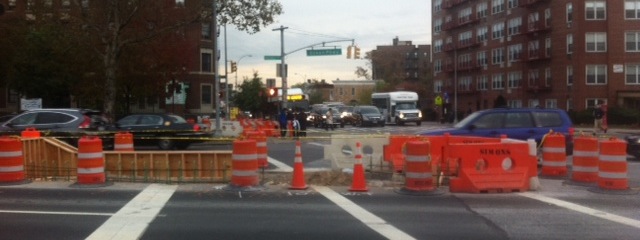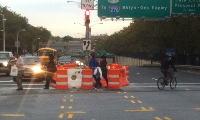 Now, the first of those changes is being installed: A new concrete pedestrian island, providing a space for people midway across the Prospect Expressway on-ramps, is under construction and scheduled for completion in mid-November, according to NYC DOT. Protective barriers, crosswalk striping, bike markings, narrower traffic lanes, and additional signage are on the way. NYC DOT is currently coming up with a schedule for installing new traffic signals that will include flashing yellow arrows for turning drivers, and the state DOT says work should be completed by the spring.