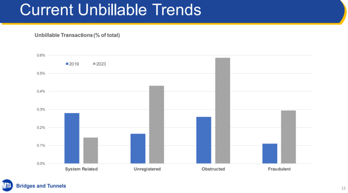 In February, the MTA said that the number of vehicles with unregistered, obstructed or fraudulent license plates rose from 1,565,190 vehicles in 2019 to 4,407,217 vehicles in 2023, a increase of 181 percent. The percentage of unbillable license plates as a percentage of all transactions also rose, from 0.5 percent to 1.3 percent.