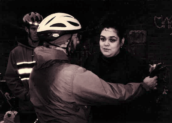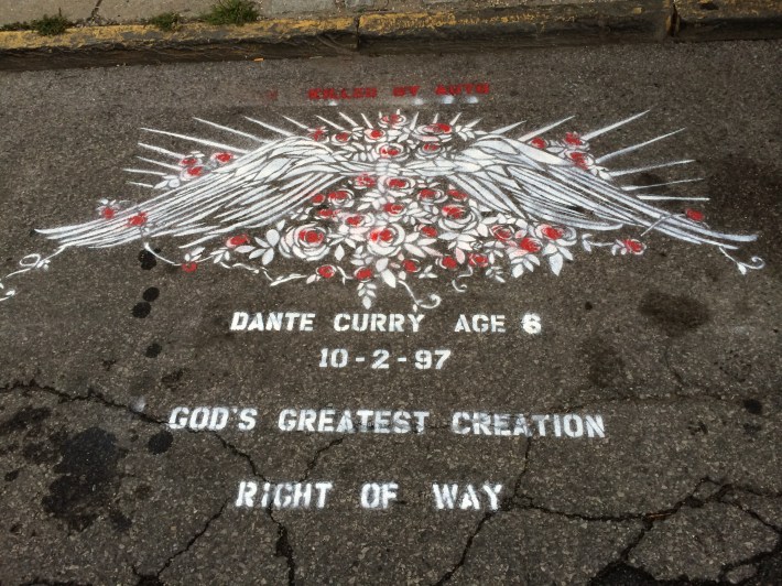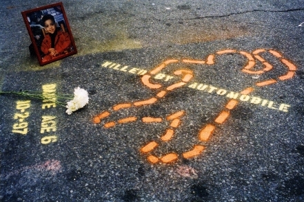 That's me with Evelyn Cancel in December 1998, on a barren block of Wales Avenue in the South Bronx, where I led a crew from Right Of Way in stenciling a street memorial for her 6-year-old son Dante, who was killed by a speeding driver.