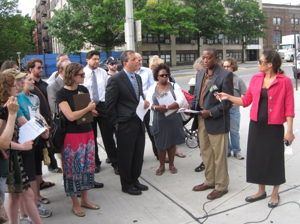 Joined by local residents, traffic safety advocates and family of Ngozi Agbim, Lander held a rally this morning at Ocean Parkway and Church Avenue, at the terminus of the Prospect Expressway, in Kensington. With nine lanes of north-south traffic and five lanes east-west, there were 36 pedestrian and cyclist injuries and four fatalities at the intersection between 1995 and 2008, according to Transportation Alternatives’ CrashStat.