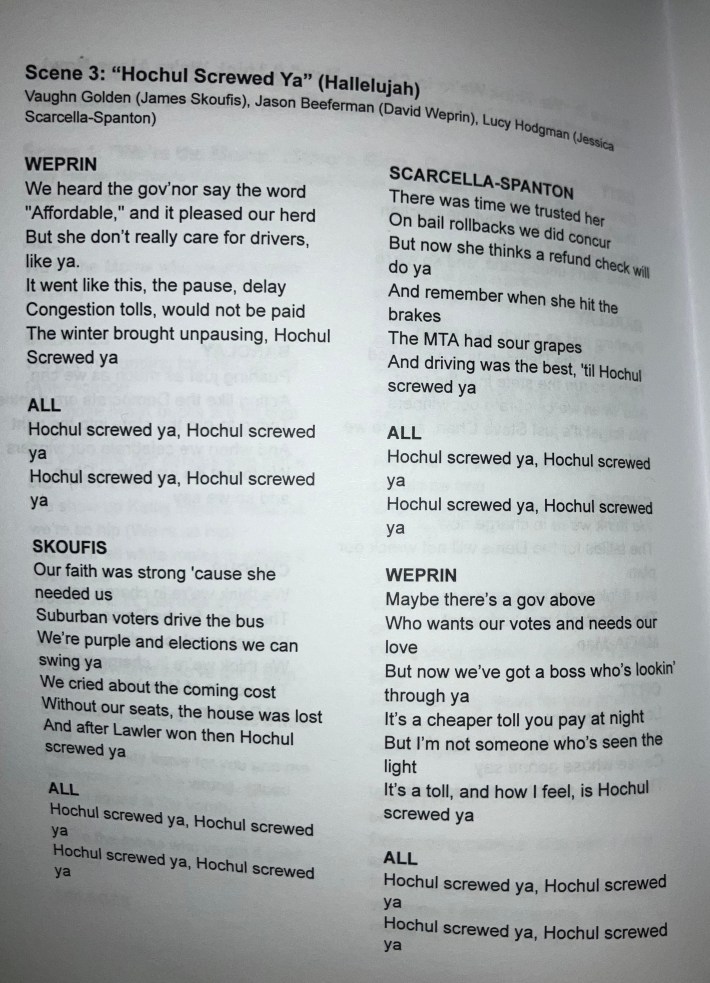 Like the very best (and, notably, worst) musical comedy, the show features a few jokes leading to the inevitable song and dance number. In the third sketch of the night — "Hochul Screwed Ya" and sung to the tune of Leonard Cohen's immortal "Hallelujah" — journalists played the roles of anti-congestion pricing pols Sen. James Skoufis (the Post's Vaughn Golden), Assembly Member David Weprin (Jason Beeferman of Politico) and Sen. Jessica Scarcella-Spanton (Albany Times-Union reporter Lucy Hodgman, daughter of comedian John Hodgman).
