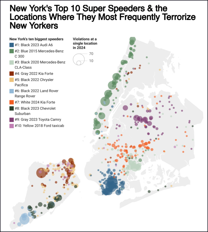 Just as great minds think alike, Streetsblog was also working on a visualization of the 2024 camera data and the city's worst drivers. Ours, by data journalist Michael Cahana, shows how these top ranking scofflaws compare to the rest of the city's offenders. Scroll through to see in incredible detail how individual drivers wreak havoc on certain neighborhoods.