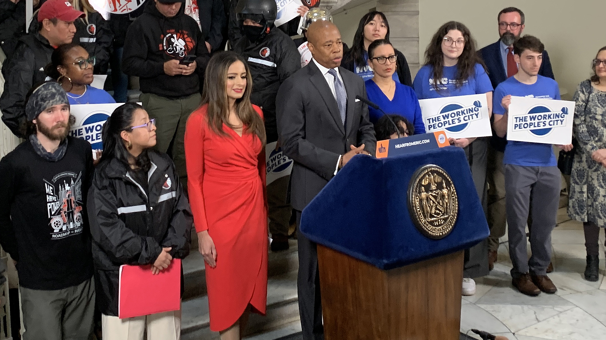 Oddly, the mayor took many off-topic questions at Monday's delivery worker presser. Juliette Papa of 1010Wins asked about the stalled delivery worker rest stop. (The mayor said the rejection by Community Board 1 "is not going to stop us from doing what is right"); another reporter asked if the mayor tips delivery workers (he claimed to always add a 15- to 20-percent gratuity); Marsha Kramer of CBS2 asked about new immigrants who sell "things" on the street (Adams claimed a deputy mayor is putting together a plan); and another reporter asked about the pace of hiring by the city.