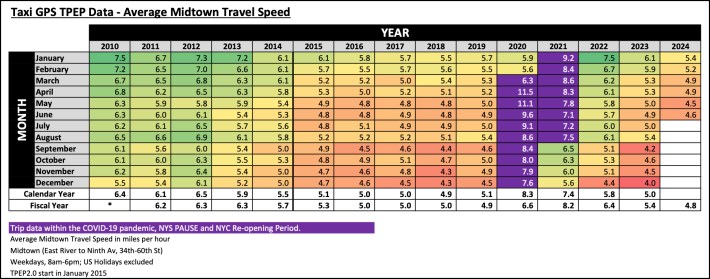 Average speeds in the CBD for 2024 dropped below 7 miles per hour last month, according to taxi and for-hire vehicle speed data analyzed by former city Traffic Commissioner Sam “Gridlock Sam” Schwartz.