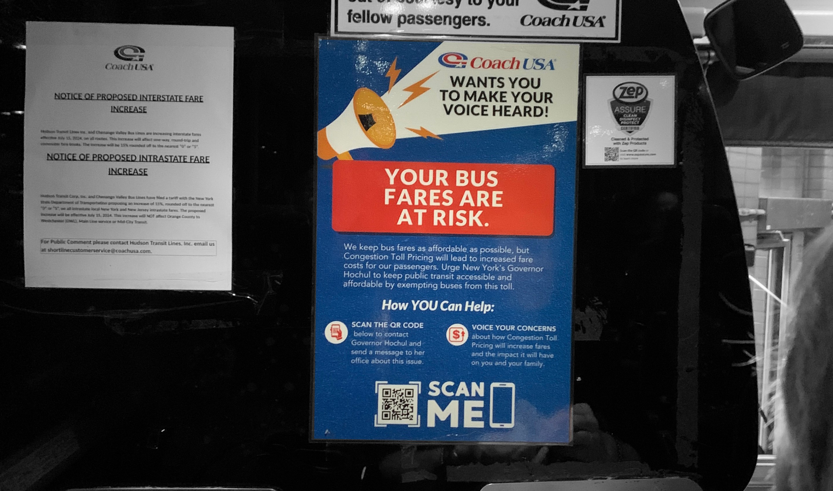 So that's how I found myself on a Coach USA bus out of Port Authority on Thursday night, stuck in outbound traffic and on the same bus on Sunday afternoon, stuck in inbound traffic. On the ride, I had plenty of time to stare at Coach USA's anti-congestion pricing propaganda.