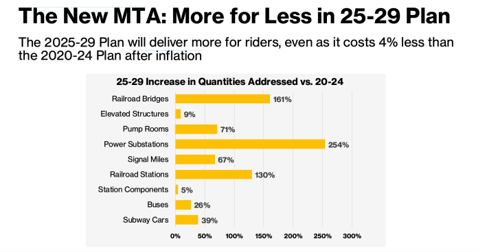 MTA officials have bragged about how much more for less they will be able to deliver in the 2025-2029 capital plan when compared to the 2020-2024 plan. Officials also emphasize that the new plan actually costs four percent less than the previous one when accounting for inflation: