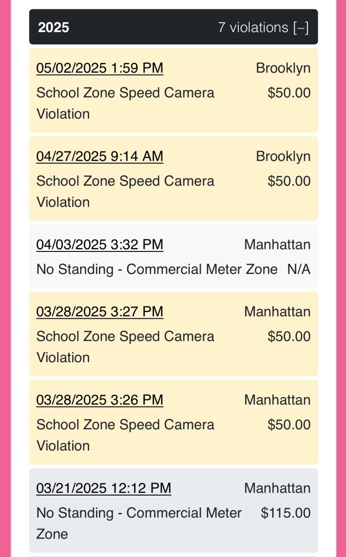 Cuomo got his most recent tickets for speeding in a school zone — which, remember, he can only receive for exceeding the speed limit by 11 or more miles per hour — on April 27 in Brooklyn and on May 2 also in Brooklyn. Like all of Cuomo's tickets, these $50 tickets were promptly paid. (Cuomo did not receive a red-light ticket for an incident last month, but that is because the city has only a few hundred red-light cameras, covering only a minuscule percentage of intersections.)