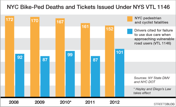 There were 152 pedestrian and cyclist fatalities in the city in 2012, according to the state Department of Motor Vehicles, and 14,327 injuries. Of those 14,479 crashes, DMV data show NYPD cited 101 motorists for careless driving. That's a citation rate of less than 1 percent.
