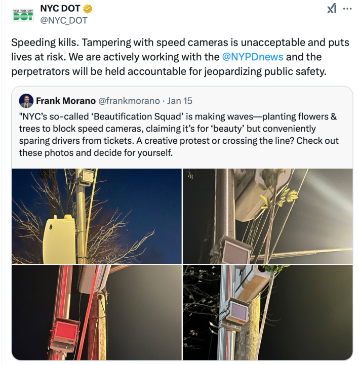 "NYC’s so-called ‘Beautification Squad’ is making waves — planting flowers & trees to block speed cameras, claiming it’s for ‘beauty’ but conveniently sparing drivers from tickets. A creative protest or crossing the line?" asked Frank Morano.