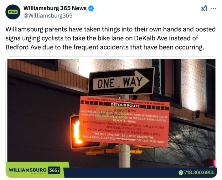 And on Thursday, a new campaign was started by Hasidic residents of Bedford Avenue to "close" the protected bike lane there on the grounds that it is unsafe for kids dropped off illegally by bus drivers.
