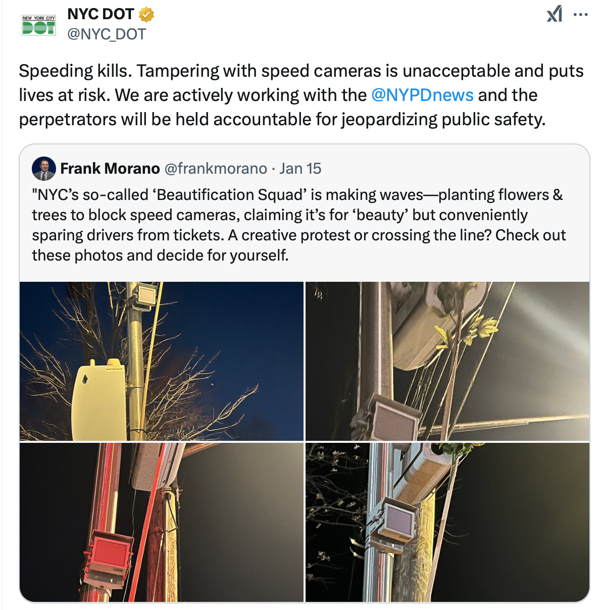 “NYC’s so-called ‘Beautification Squad’ is making waves — planting flowers & trees to block speed cameras, claiming it’s for ‘beauty’ but conveniently sparing drivers from tickets. A creative protest or crossing the line?” asked Frank Morano.