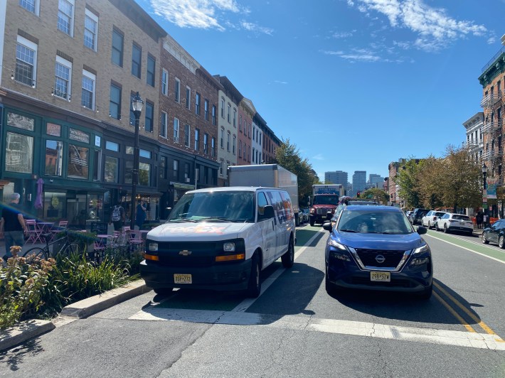 Streetsblog found cars in the bike lanes on almost every block of the corridor, forcing cyclists to weave into dangerous car traffic.