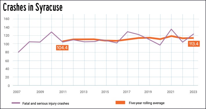 Syracuse has long had a road violence problem. According to federal stats covering 2019 through 2023, there were 567 car crashes in the city, causing 42 deaths and 608 serious injuries. Nearly half of the fatal crashes involved a pedestrian or bicyclist. Syracuse’s fatality rate (deaths per year per 100,000 residents) is 7.27, which is 40 percent higher than the state’s rate and 150 percent higher than New York City’s below-3.0 rate.