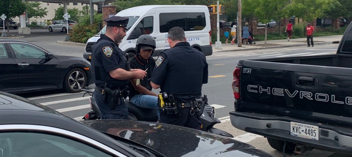 The NYPD does not appear to even be playing a role in issuing warnings to moped users who cross city bridges; two police officers are stationed round-the-clock at the foot of the Brooklyn Bridge, for example, yet Streetsblog watched more than a dozen moped riders fly right past them last week without even a warning.