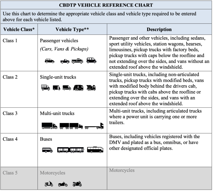 For the SGVOE, the agency will also have to provide a description of the specific function performed by a given vehicle, whether it's a car or van (class 1), a "single-unit truck" (class 2), a big truck (class 3) or a bus (class 4). (A detailed chart is below; note that motorcycles, which are class 5, are not eligible for exemptions):