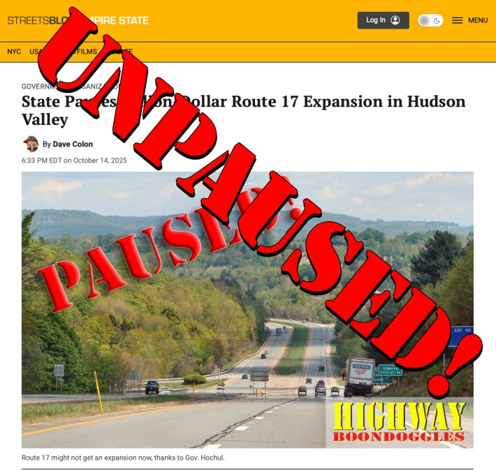 "What we've heard from state DOT leadership is that what has been called a 'pause' is more of a delay," Rethink Route 17 Alliance spokesperson Taylor Jaffe told Streetsblog.