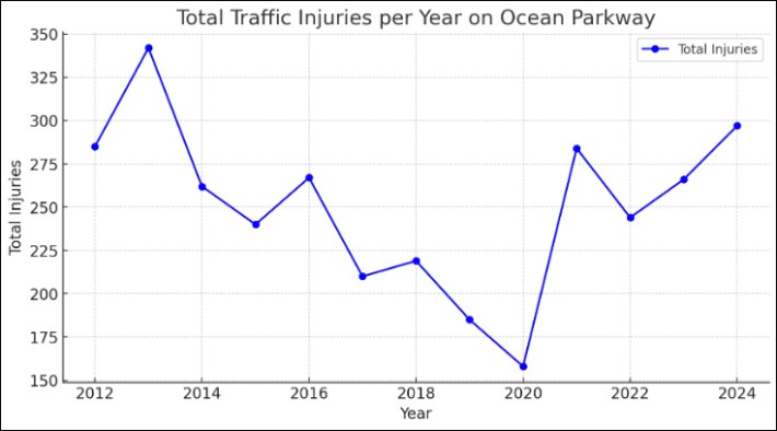 The rise in injury-causing crashes, which began in 2021, followed years of improved safety on Ocean Parkway as the state Department of Transportation made small design tweaks and the city installed speed cameras on the corridor.