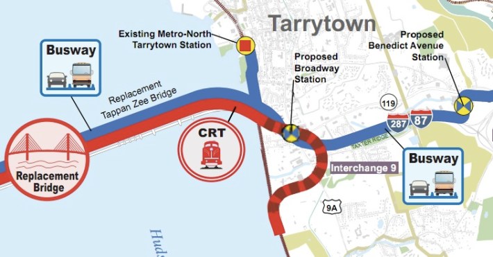 Including transit on the bridge has run into some local political resistance lately. This July, Westchester County Executive Rob Astorino called for the removal of transit from the plans for the bridge in order to lower costs and speed up construction. As the Tri-State Transportation Campaign reported at the time, the bridge and highway components of the project are projected to cost $8.3 billion. Building the bridge with rail would add $6.7 billion, while the bus system would cost around $1 billion. Astorino's office told Streetsblog that they hadn't heard that the transit component had been postponed and that it was too early for any design to have been selected.